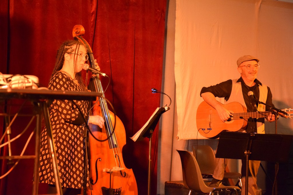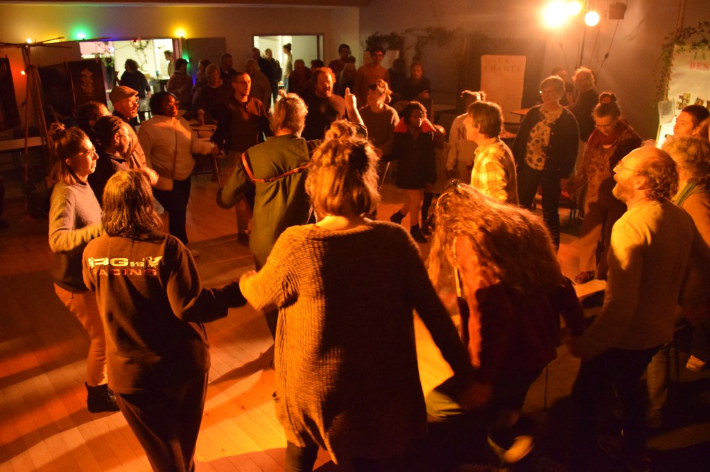Maëlle, membre du collectif, éleveuse en vaches laitières, anime un moment d’impro vocale avec Marion – Maëlle et Marion, des tisseuses d’instants sur le fil… dimanche 14 décembre.